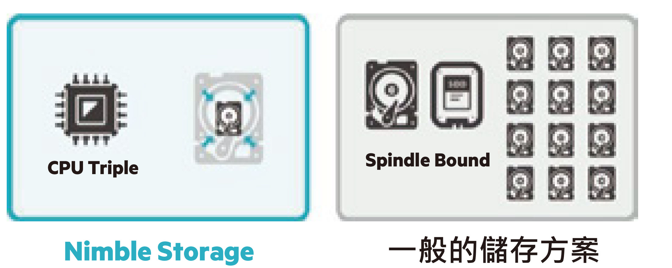 Nimble Storage HF 系列的效能表現與硬碟種類或顆數無關,在搭配上即時線上壓縮功能與線上重複資料刪除, 進而達成壓倒性的空間節省比與低耗電表現。 但其他一般的儲存方案須利用大量的硬碟顆數來提升整體儲存效能,相對的會浪費過多的空間浪費,且造成大量電力耗損。