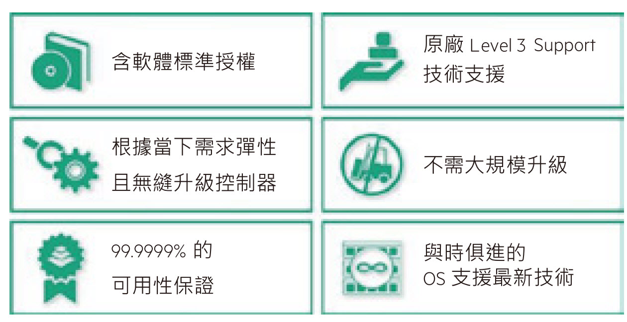 高效能且可擴充的全快閃與混合型快閃陣列,所有型號的可用性都高達>99.9999% (六個 9)。 模組化與簡易的擴充性,讓您無須變更既有設備即可垂直與橫向擴充。