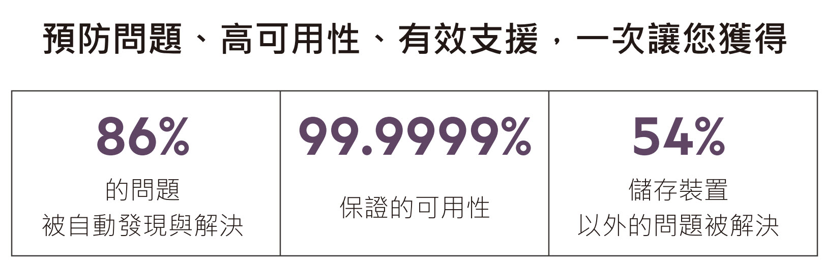每天由全世界所配置的磁碟陣列中收集 3 千萬 ~ 7 千萬件的感測資料以 AI 進行分析,進行預防性偵測並提供各種支援。 藉此達成 99.9999% 的可用性,且有 90% 的問題均可由後端檢測出。 Nimble Storage 提供 99.9999% 的可用性保證。