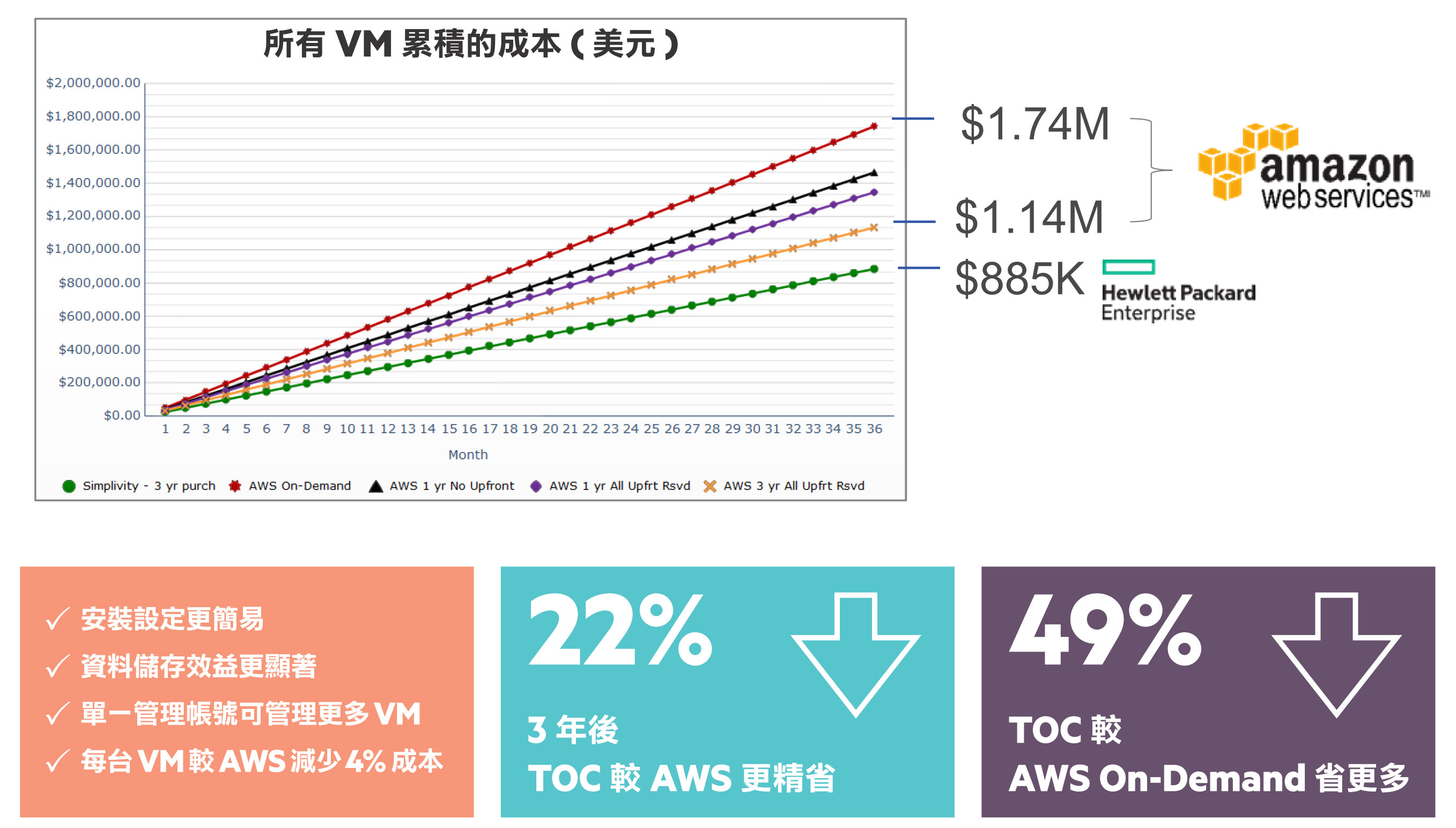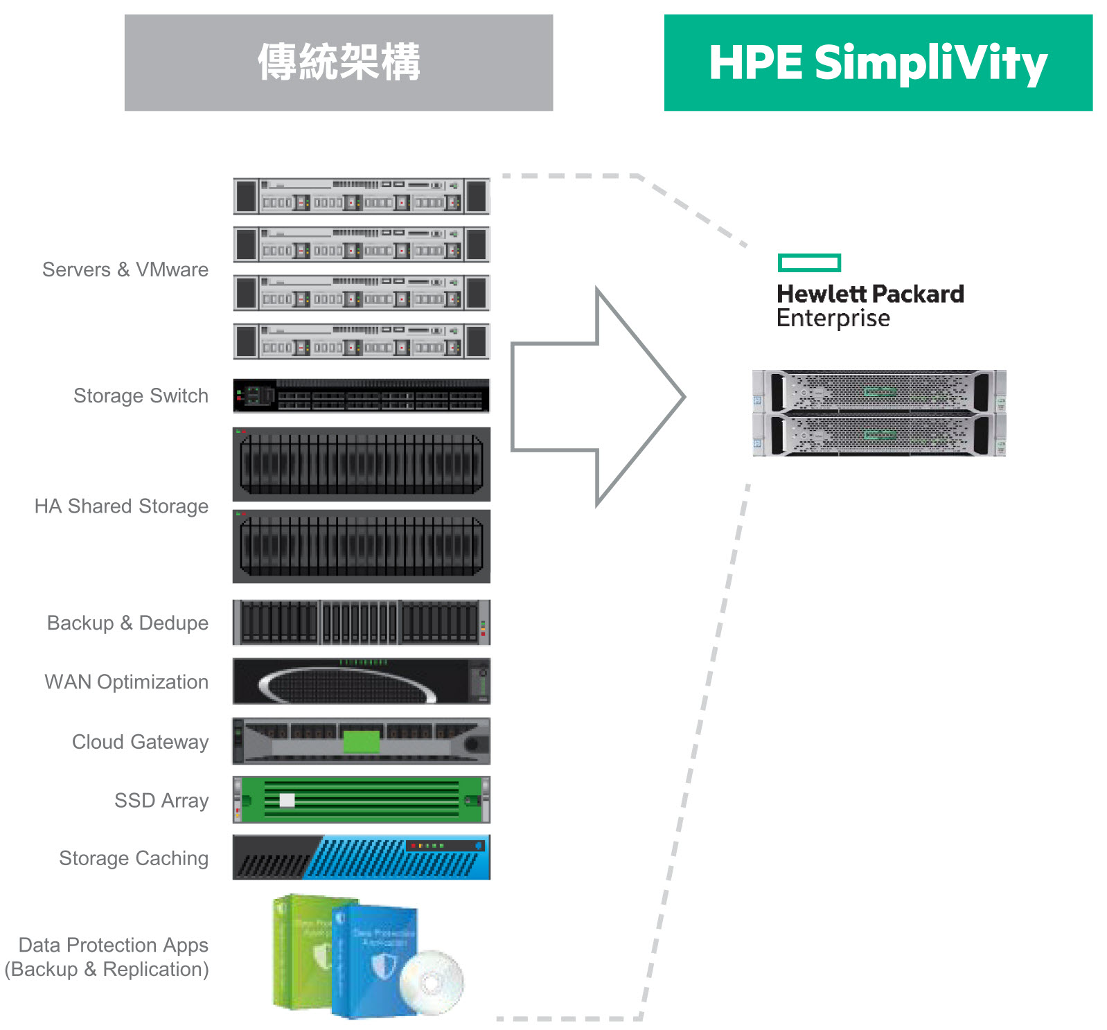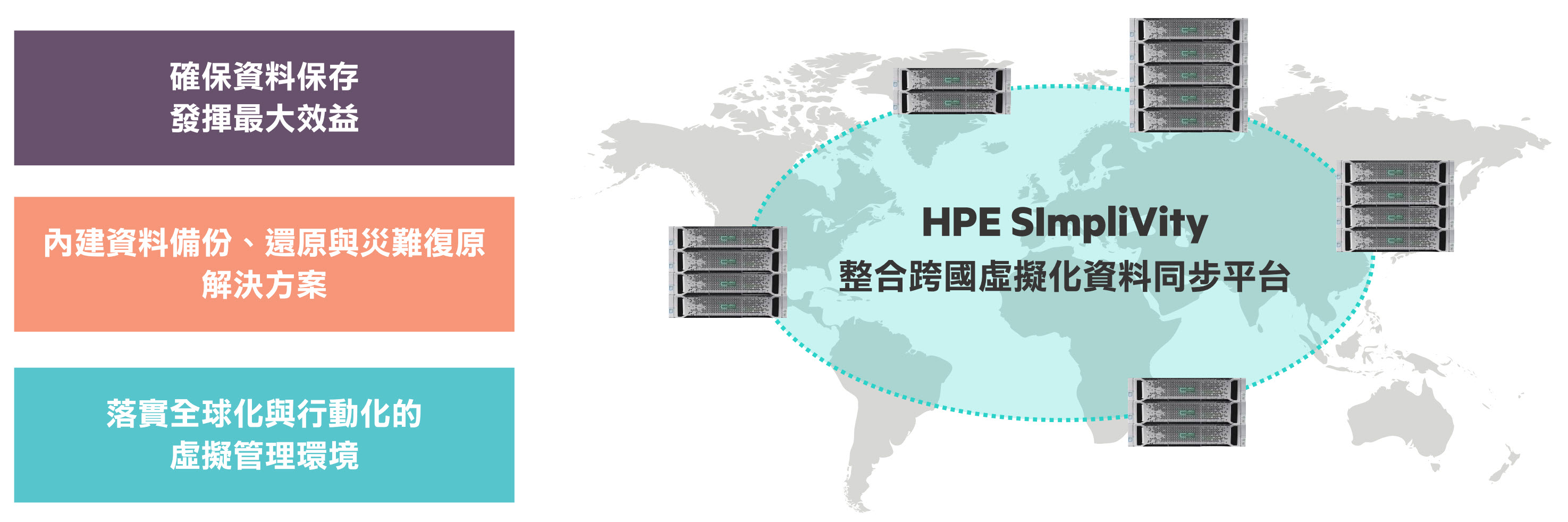 大幅整合儲存與運算兩大核心資源,並透過軟體定義技術將許多重複資料刪除、備份備援等進階管理系統軟體化, HPE SimpliVity充分與硬體緊密結合,為企業降低基礎系統的整合門檻,也大幅減少 IT 營運的各項成本。