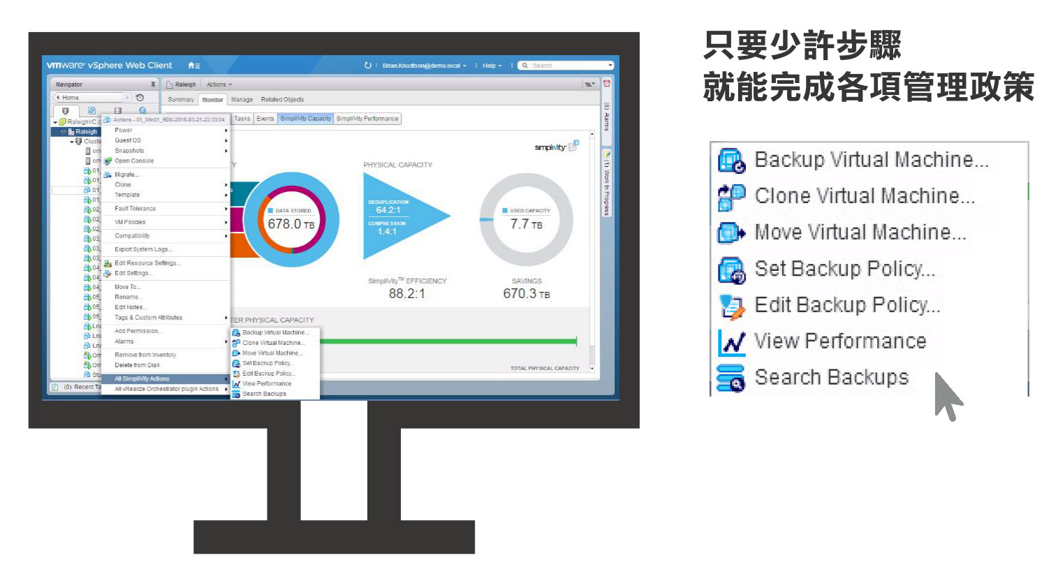 HPE SimpliVity 的管理介面與虛擬化平台深度整合,並能透過網域網路達到跨區管理的目標,管理介面上除了能獲得底層硬體資訊, 虛擬平台上的 IT 資源與虛擬機器狀態亦可一目了然; 虛擬環境上的自動化排程管理等工作,也能運用 SimpliVity 的管理介面迅速落實。