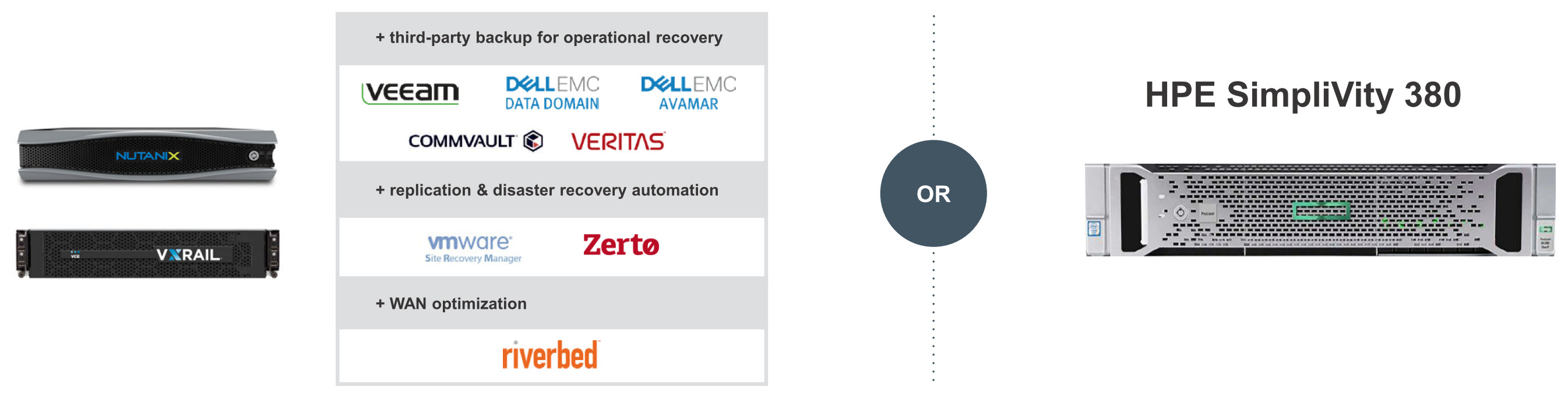 相較於一般超融合系統僅整合伺服器與儲存設備兩部分, HPE SimpliVity 更結合了資料備份、虛擬平台、廣域網路加速、以及應用管理等解決方案, 整合層面涵蓋軟體與硬體兩大部分,傳統需要一整個機櫃才能處理的,HPE SimpliVity 僅需 4U 的空間就能達成, 大幅提升企業基礎系統的建置效率,針對如軟體開發測試、快速擴充IT資源等專案, HPE SimpliVity 都能在企業的 IT 基礎環境中提供最具彈性且精簡的硬體系統。