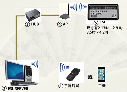 組成部分包括电子貨架標籤、中轉基站(Access Point)、手持终端以及ESL管理軟件。一台中轉基站(Access Point)通常可以管理上千個電子標籤。